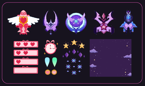A small spritesheet featuring 5 different pixel-art spaceships, projectiles, HUD elements and an infinite-scroll background. Perfect for creating your own magical space shooter!